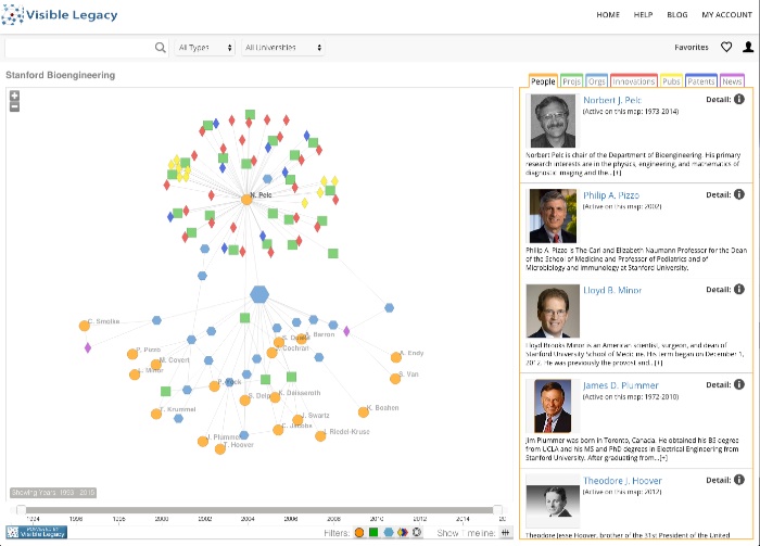 The Visible Legacy Navigator presents the timeline of innovation through the collaboration of organizations of people working on projects. Use Navigator maps and profiles to show what your organization is known for. Automatically collected and organized Organizations are mapped automatically from public online sources. Contact us to expedite the mapping of your organization. Claim your page Use our Advanced Search for a person or an organization. If you are in the map, you can "claim your page" to select featured works and website destinations for Visible Legacy Navigator. Learn how to Claim your Page. In a hurry? We'll expedite you No time to check? We'll map you. For a limited time we're expediting researchers and labs in the Stanford community. If you have a stanford.edu email, just use the Contact Us form with "add me!" in the subject. We'll map you and send the link to your map. |